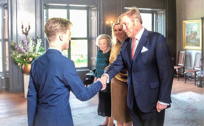 "Op de uitnodiging stond een dresscode vermeld: een donker pak. Dat had ik als 22-jarige jongen niet in de kast hangen. Met mijn oma, moeder en zus ging ik naar Van Tilburg. Ik zie nog de verbazing op het gezicht van de modeadviseur voor me, toen ik vertelde waarvoor we kwamen. Uiteindelijk kon ik in een fantastisch koningsblauw pak, dat perfect op maat werd gemaakt, aanschuiven in Paleis Huis ten Bosch. Ik zat zelfs naast prinses Beatrix."